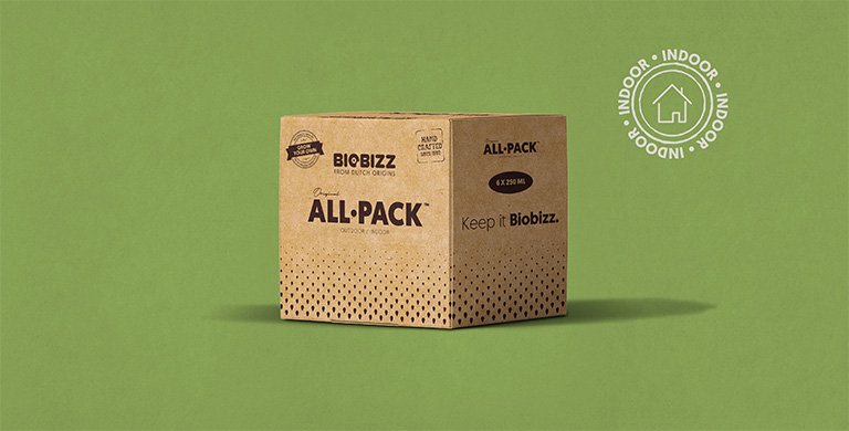 Le nouveau Biobizz All·Pack Indoor 250 ml est la manière idéale de découvrir l’écosystème Biobizz : six nutriments et stimulants organiques essentiels qui accompagnent vos plantes à chaque étape de leur croissance, le tout dans une boîte pratique.
